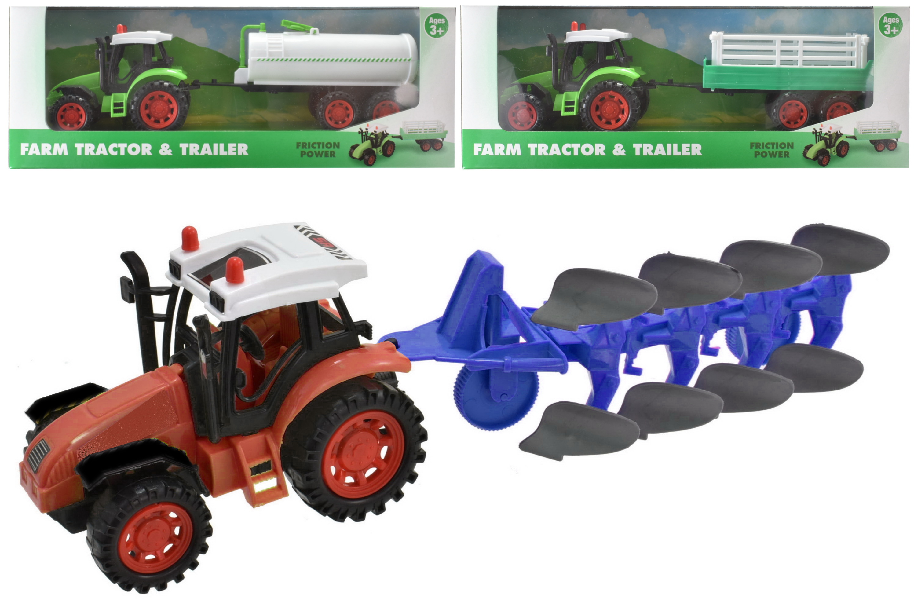Friction Tractor & Trailer or Plough (3 asstd.) (37x13x9cm) (3+ YRS)