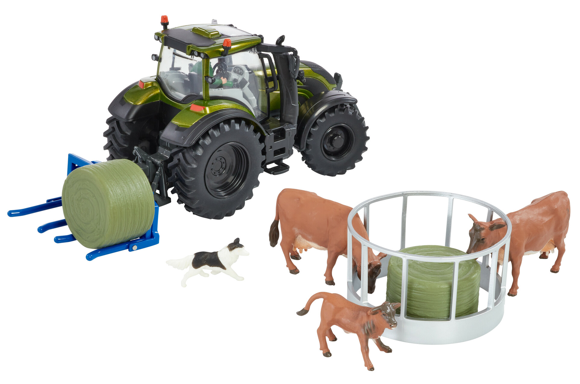 Britains 43323: Metallic Olive Green Valtra Playset (+ Cow Feeder + Bale Lifter)