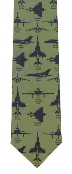 Men's Tie: British Fighter Planes on Green (Hawk / Tornado / Typhoon / Harrier)